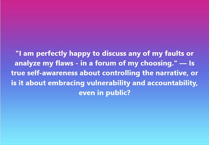 “I am perfectly happy to discuss any of my faults or analyze my flaws — in a forum of my choosing.” — Is true self-awareness about controlling the narrative, or is it about embracing vulnerability and accountability, even in public?