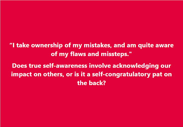 Does true self-awareness involve acknowledging our impact on others, or is it a self-congratulatory pat on the back?